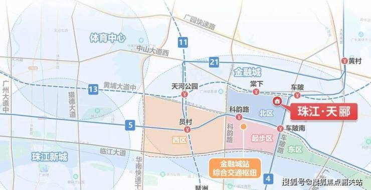 珠江天郦所处的金融城北区,东至车陂路,西接科韵路,南连黄埔大道,北依中山大道,是典型的“城市十字交汇板块”。这一板块并非单一住宅区,而是融合了金融办公、科技产业、商业配套与成熟社区的复合功能区。相较金融城起步区偏重商务属性,北区在居住属性上更加成熟、稳定。