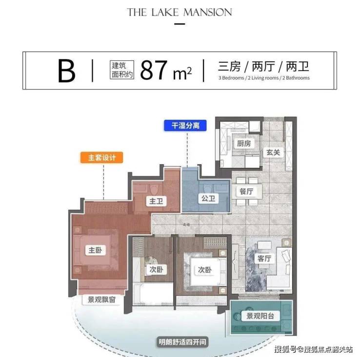 建面87平三房两卫,主卧套房设计,带有独立卫浴,入户玄关,增加收纳空间,四开间朝景