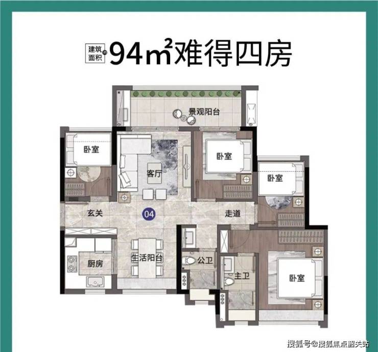 建面107平四房两卫,超高实用率,约6.8长景观阳台,主卧套房设计