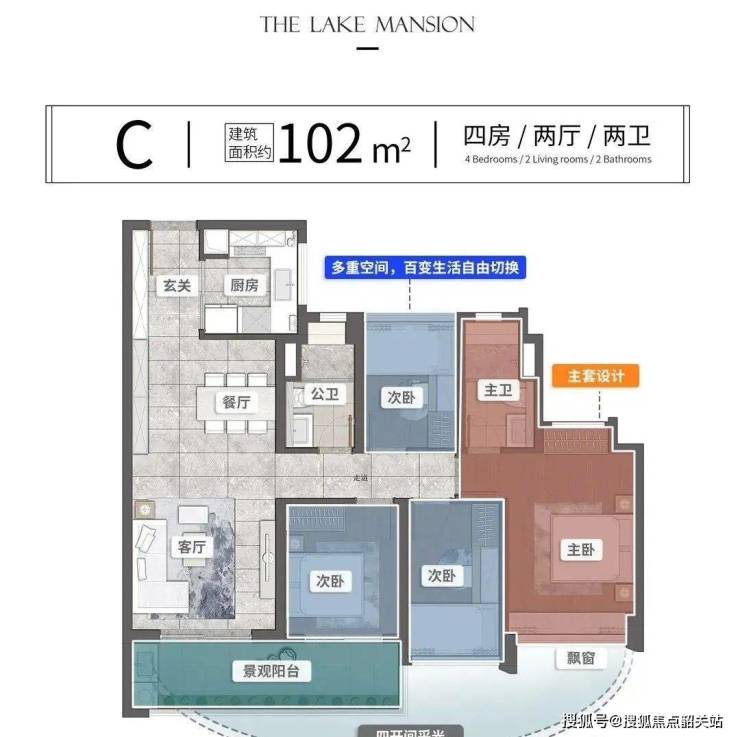 建面102平四房两卫,东南朝向,四开间朝南,套房式主卧,超6米景观阳台