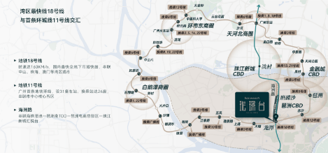 广州地铁·珑璟台构建双地铁+主干道+跨境交通三位一体的世界级立体交通网络,实现全城畅达、湾区联动、跨境直达的高效出行体验。轨道交通方面,项目紧邻地铁11号线与18号线交汇龙潭站,步行距离仅约90米,真正实现地铁入户级便捷体验。18号线作为国内速度领先的全地下市域快线,串联广州、中山、珠海、澳门等湾区核心城市,构建一小时湾区生活圈;11号线作为广州首条地铁环线,设31座站点、26座换乘站,无缝接驳全城所有地铁线路。搭乘地铁1站直达琶洲、2站抵达珠江新城、3站直通金融城,高效串联三大核心CBD。道路交通方面,项目坐拥四纵三横城市主干道网络,海洲路无缝衔接海珠湿地、琶洲南TOD、电商总部及珠江新城,自驾15分钟覆盖全城核心商圈,通勤效率领先主城多数项目。跨境交通方面,琶洲港澳客运码头水上航线快速直达港澳,低空飞行中心9分钟接驳白云机场,26分钟直达香港机场,形成海陆空立体化跨境出行体系。