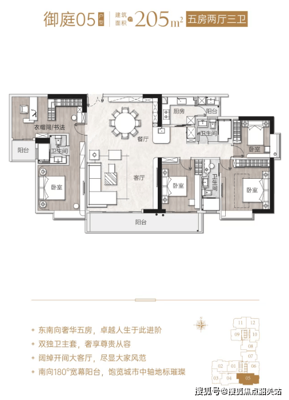 205平方米的产品则拥有双独卫的主套设计,居住体验更为尊贵。阔绰开间的大客厅,搭配南向180度的宽幕阳台,可以饱览城市中轴的地标璀璨。