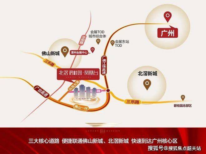 三大核心干道畅通佛山新城、北滘形成、广州核心区,乐一路(规划拓宽)紧临项目,快速接驳华阳路及佛山一环,通达会展中心,快速到达北滘新城、佛山新城;三乐路往西接华阳路,通达往佛山新城,往东接驳北滘新城生活圈、碧桂园总部区、机器人智谷产业区;广台高速接驳广佛江珠,快速连通广佛各区,实现1小时粤港澳大湾区生活圈。