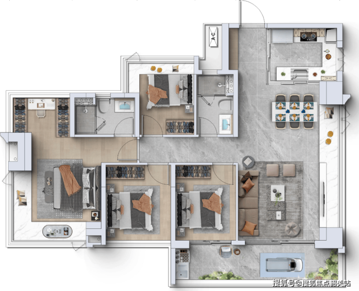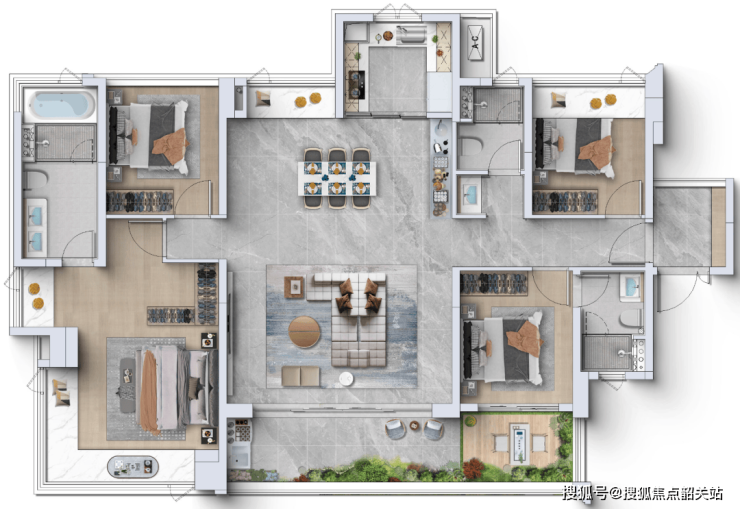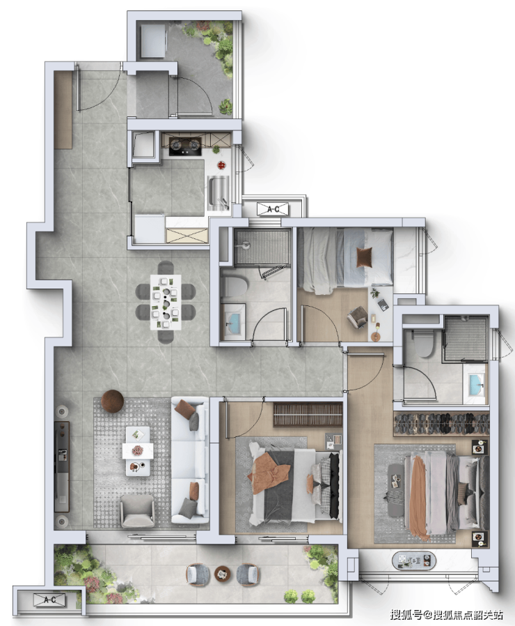 105㎡:四房设计,超6米阳台,动静分区,三开间朝南,南北通透。