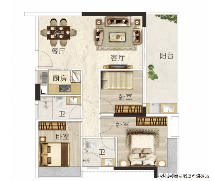 E户型,建面约106平方米,三房两厅两卫。阔绰双厅,宴请亲朋,尽显大家风范。超大宽面阳台,一家人的空中大花园。主卧带转角飘窗,视野开阔无遮挡。这个户型兼顾了功能和舒适性,适合大多数家庭。