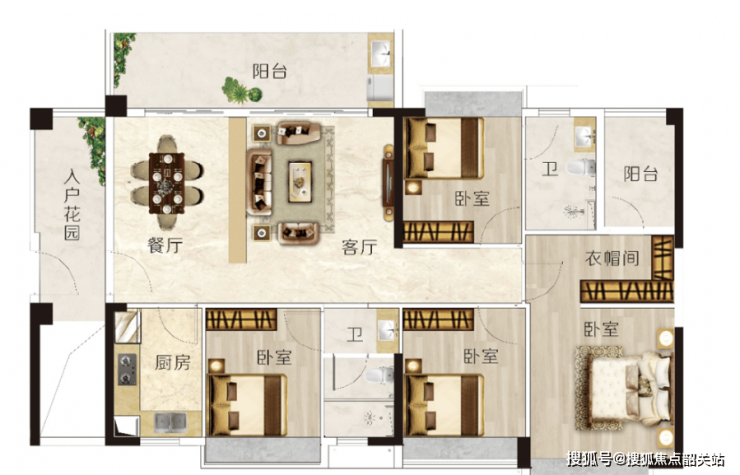 A户型,建面约101平方米,三房两厅两卫。这个户型最大的亮点是入户花园和超广角巨幕阳台。入户花园可以作为过渡空间,增加仪式感,也可以用来做收纳,摆放鞋柜、杂物等。超广角阳台,视野开阔无遮挡,无论是看江景还是看园林,都非常舒服。主卧套房设计,奢享主角尊贵礼遇,U型厨房设计,洗切炒操作自如,功能分区明确,使用非常方便。