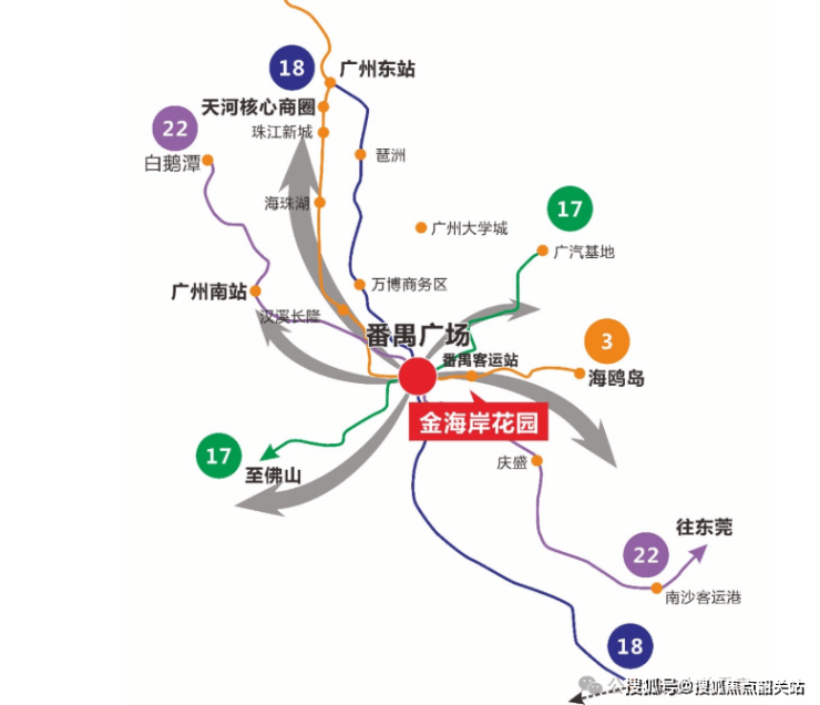 项目雄踞双TOD枢纽中心,什么是TOD?就是以公共交通为导向的开发模式。简单来说,就是地铁就在你家门口,或者离你家非常近。金海岸花园,坐拥番禺客运站与番禺广场双TOD,这已经是相当奢侈的配置了。更厉害的是,这里是五轨交汇的超级枢纽。哪五条线?3号线、3号线东延线、18号线、22号线、17号线(规划中)。这五大轨道交通网络,如同城市的血管一样,将金海岸花园与广州的各个角落紧密相连。