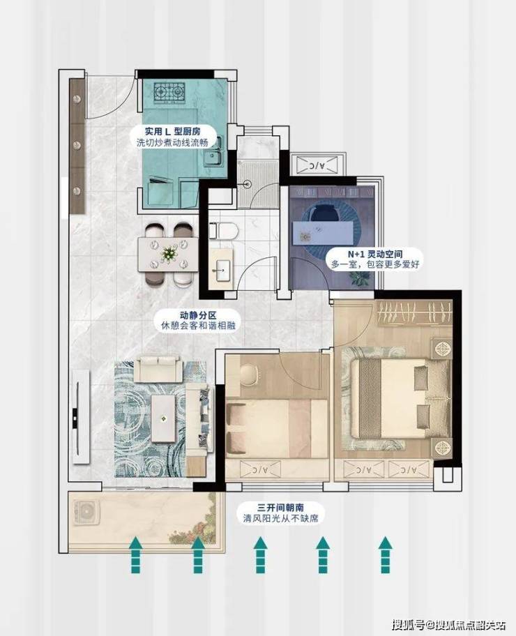 70平方米南向三房:三开间朝南,拥有高实用率,适合追求品质生活的年轻菁英,同价多一房,让每个追求品质的斜杠青年随心拓展兴趣边界。