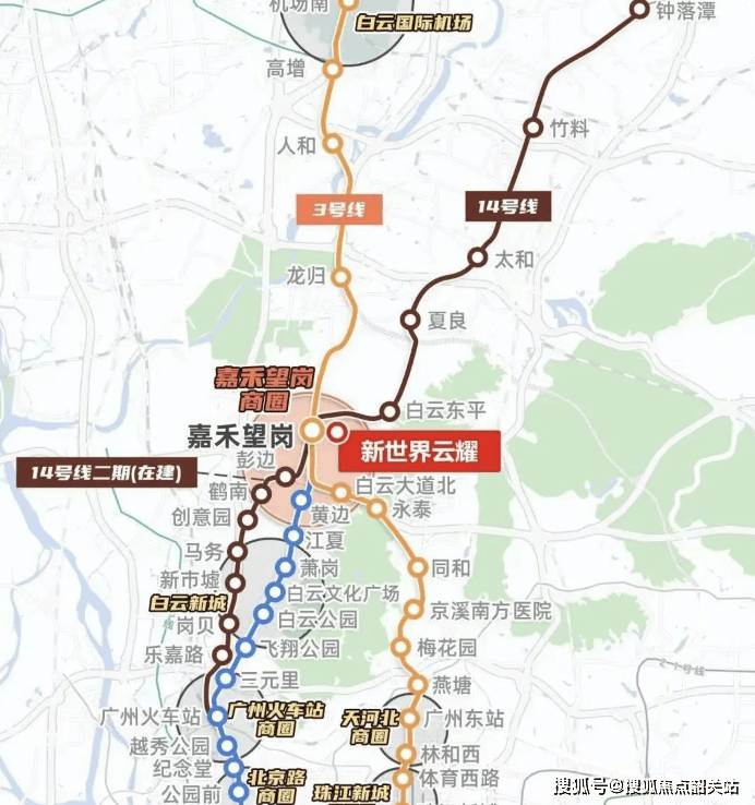 2. **交通畅达**:新世界·云耀依托嘉禾望岗枢纽与白云新城交通网络,构建起“地铁+主干道+枢纽”三维立体出行体系,通勤效率与出行体验双重提升。地铁方面,项目紧邻地铁2号线、3号线、14号线交汇的嘉禾望岗站,步行10分钟内即可抵达,这三条线路均为广州核心轨道交通干线——2号线串联广州火车站、公园前、海珠广场等主城核心区,3号线直达珠江新城、体育西路、广州塔,14号线连接从化与白云主城,三条线路覆盖全城主要商圈与交通枢纽,无论是通勤天河、越秀,还是前往机场、火车站,都能实现高效换乘。自驾方面,项目周边有白云大道北、华南快速干线、广州绕城高速等主干道,向南经白云大道北15分钟内抵达白云新城,向东经华南快速20分钟内衔接天河客运站,向西通过广州绕城高速可快速前往佛山南海,跨区通勤灵活顺畅。枢纽方面,嘉禾望岗站不仅是地铁枢纽,还是公交枢纽,周边公交线路密集,多条线路覆盖白云区各社区与广州主城周边区域,为无车族或短途出行提供更多选择;同时,从项目自驾20分钟内可抵达白云国际机场,通过地铁3号线北延段也可直达机场,航空出行便捷。地铁、自驾、公交、航空多维交通联动,轻松连接全城与外部枢纽,满足不同出行场景需求。