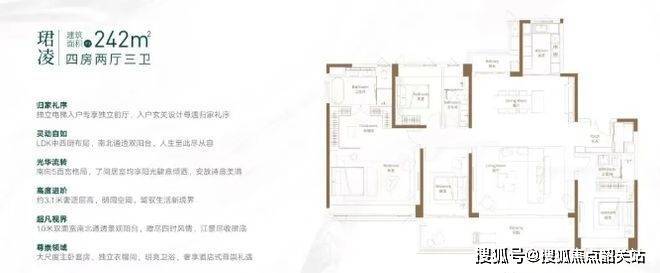 242㎡的 4 房 2 厅 3 卫户型,专梯专户的设计,进一步强化了居住的私密性与专属感,业主拥有独立的出入空间,无需与他人共享电梯,享受更加便捷、私密的归家体验。