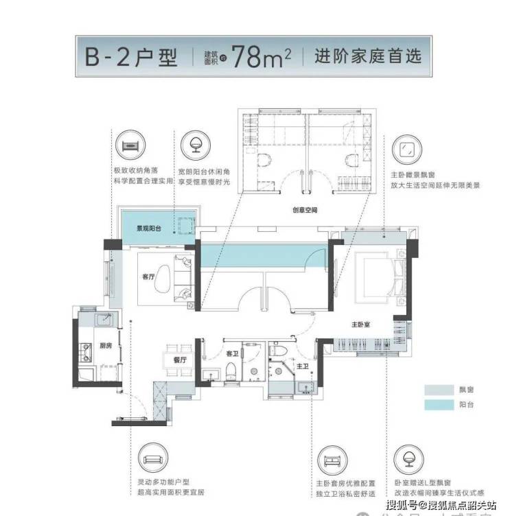 主力户型集中在68–105㎡之间,我重点看了89㎡的三房两卫样板间。进门是独立玄关,右侧预留了家政柜位置;客厅开间约3.6米,阳台连通次卧,采光通透;主卧带飘窗,能放下1.8米床加衣柜;两个卫生间都做了干湿分离。得房率在同区域高层产品中表现不错,没有为了“赠送面积”牺牲动线合理性,适合长期自住。