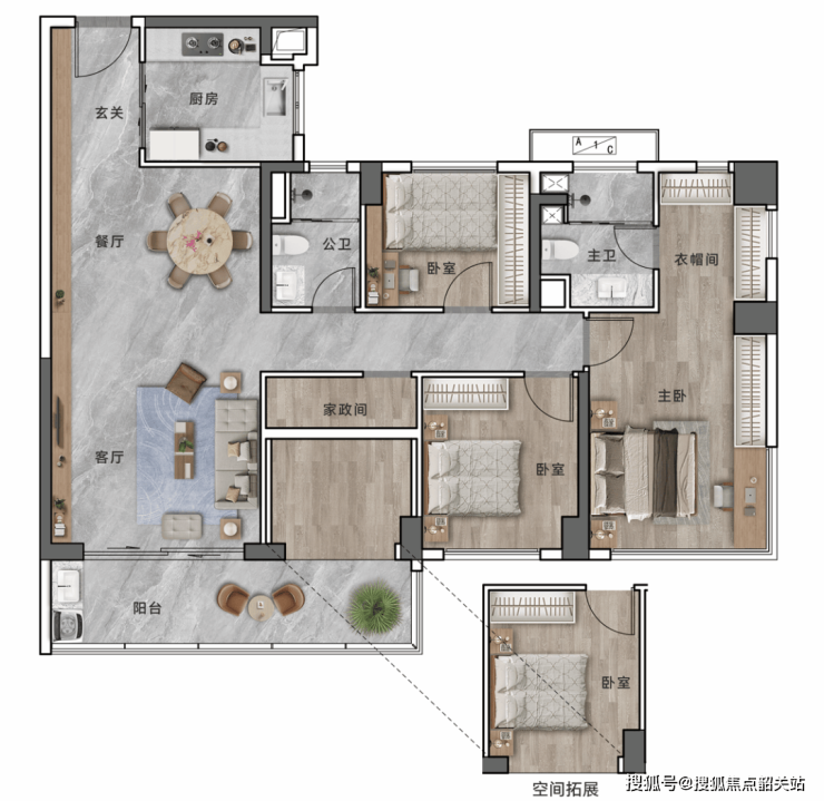 在建筑形态上,项目采用了低梯户比的设计。这在高层住宅中是非常难得的。传统的超高层住宅往往梯户比高达3梯12户甚至更高,等电梯的时间长,隐私性差,邻里关系也相对淡漠。而东建·天赋龙湾通过优化楼栋布局,实现了更舒适的居住体验。比如部分户型采用了T2板式布局,专梯专户的归家礼遇,这不仅提升了居住的尊贵感,更在私密性和安全性上做到了极致。