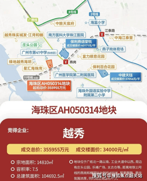 越秀·熙悦江湾于2024年9月19日由越秀地产以楼面价3.4万/㎡、总价35.6亿元竞得。该地块占地面积约14810平方米,出让面积为13959平方米,总建筑面积约为104693平方米。尽管体量不大,但其位于海珠区重点开发的广纸板块,且背靠越秀·星汇海珠湾这一成熟大盘,具备完善的配套设施。此外,项目户型设计达到了120%的使用率,成为海珠西在售新盘中的一大亮点。