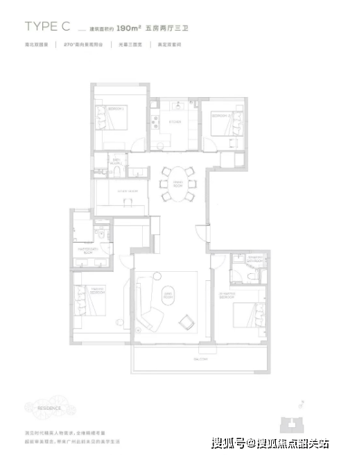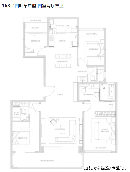四叶草户型: 四室两厅三卫,面积约168平方米