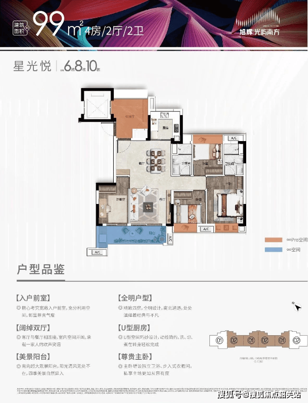 99-114平方米进阶奢阔生活:全朝南开间设计,动静分离,方正实用,大尺度双联阳台,采光通风更佳。