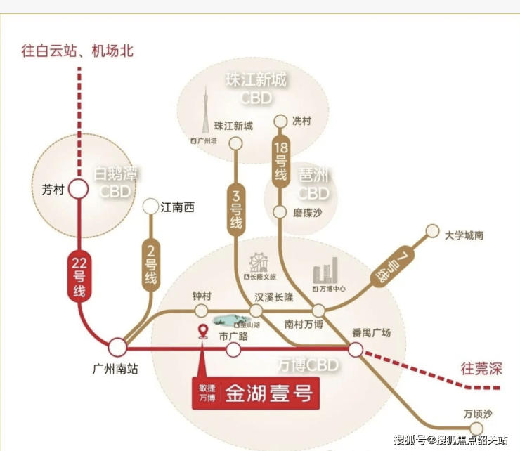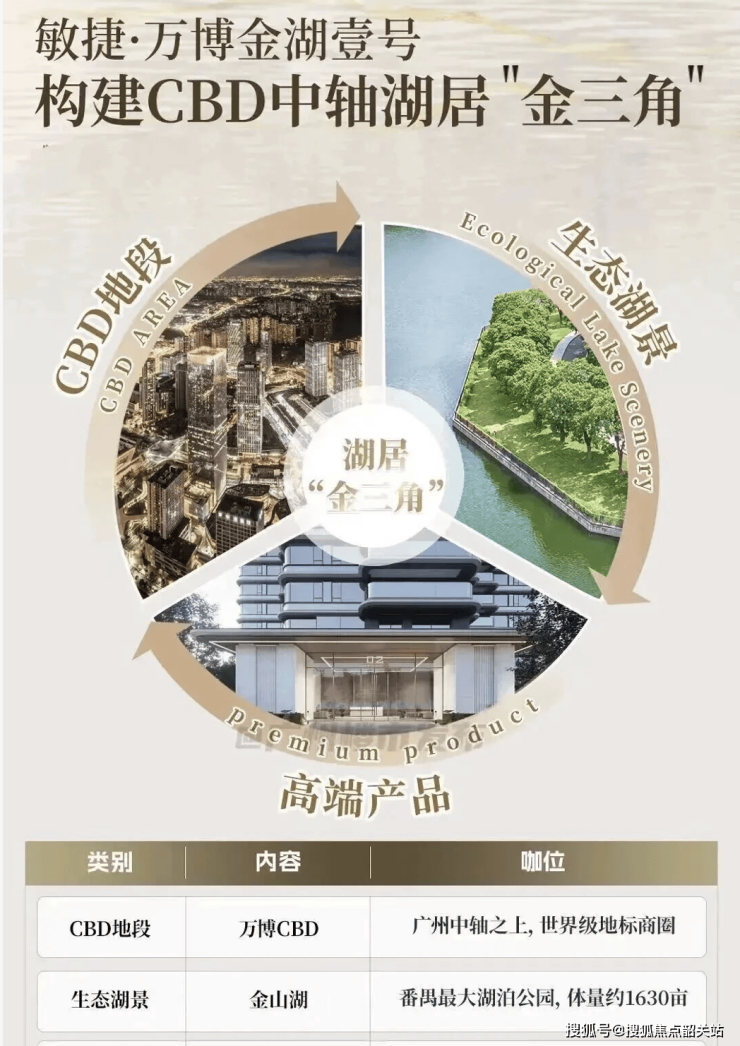 敏捷万博金湖壹号定位为万博CBD中轴低密湖居奢宅,是区域内罕见的集CBD繁华、稀缺湖景、优质教育于一体的改善型大盘。项目择址极具战略眼光,立足万博CBD 3.0时代核心版图,依托区域从1.5平方公里到7.2平方公里的扩容升级机遇,坐拥总部云集的世界级商圈、国内TOP4长隆主题乐园及千亩金山湖生态资源,实现了繁华与自然的完美平衡。从择址逻辑来看,项目紧邻番禺最大湖泊公园——金山湖文化公园,同时依托双地铁交汇的交通优势,无缝衔接珠江新城、琶洲CBD等核心区域,既占据城市发展红利,又独享稀缺生态资源,复刻纽约曼哈顿中央公园、深圳福田香蜜湖的世界湖居共识,成为广州城央湖居的全新范本。