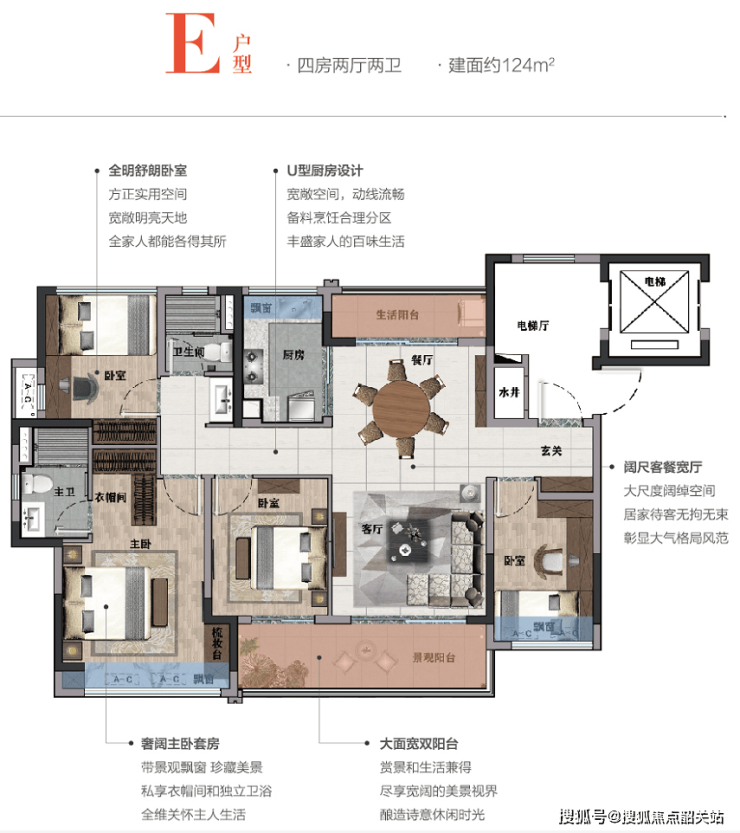 户型图展示了全南向、高拓空间等亮点,如 124㎡小高层私家电梯入户,82-106㎡高层全四开间朝南,让购房者直观感受空间优势,吸引关注。售楼处电话: 提供购房咨询的联系方式 400-622-0051