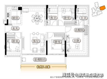 106平米四房:升级版设计,7.2米长连通次卧的大阳台,入户标准次卧,主卧更阔绰。