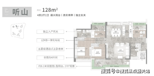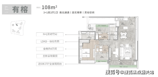 建面108平3+1房:四开间朝南,近6米南向阳台,270度景观视野,LDKB一体化设计,5.9米大方厅,奢阔大主套,配置南向大飘窗、独立卫浴与L型衣帽间,空间通透,实用性强,适合刚需改善家庭。