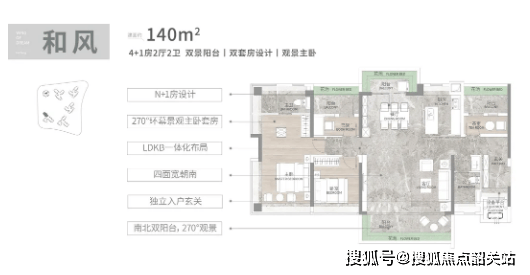 建面140平4+1房:四开间朝南,南向采光面达15.7米,南北双阳台,LDKB一体化设计,主套配置270度折叠屏飘窗,空间开阔,舒适度高,可满足多人口家庭的居住需求,兼具实用性与私密性。