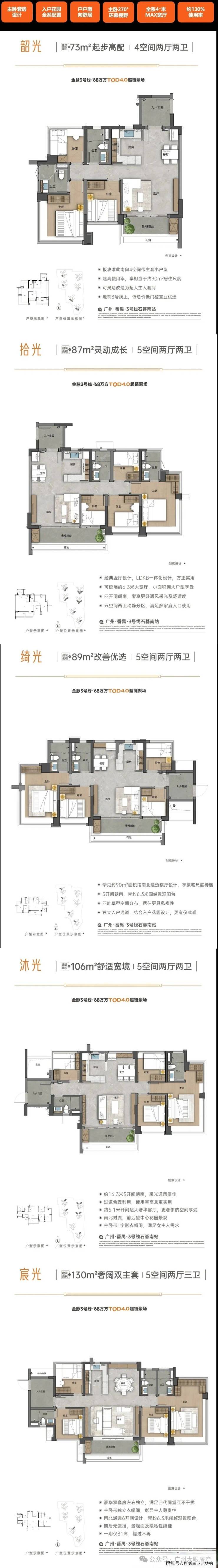 项目首推1#、2#楼(32层,两梯五户),后续将推出3#、4#(42层,三梯五户)及8#、9#(47层,三梯五户)。主力户型涵盖建面约73㎡、87-89㎡、109㎡、130㎡的四至五房,精准匹配不同家庭结构需求。