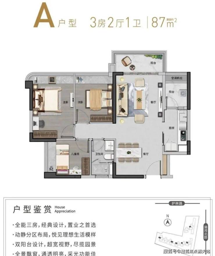 主力户型集中在85㎡三房和105㎡四房,得房率在同区域里算不错。85㎡户型做到了南北通透,主卧带飘窗,厨房U型布局,操作动线合理;105㎡则多了一个多功能房,适合二胎家庭或居家办公。样板间里没做太多夸张改造,能看出开发商在空间利用上更偏向实用主义——比如阳台预留了洗衣机位,玄关做了下沉式设计防尘,这些细节对真实居住体验挺加分。