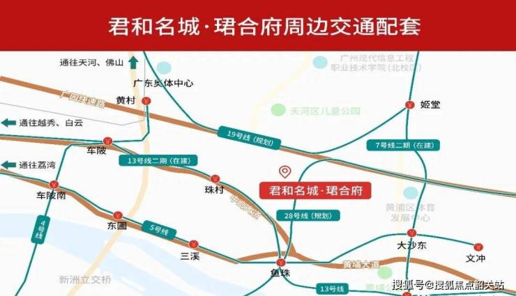 项目距离地铁5号线大沙地站步行约800米,实测走过去差不多8分钟。早高峰打车到珠江新城CBD,平均25分钟左右。更关键的是,7号线二期(大沙东站)和13号线(裕丰围站)也在附近设站,未来三条地铁交汇,通勤选择比现在更灵活。地面交通也不弱——广园快速、黄埔大道、广佛高速和广州环城高速形成“三横一纵”路网,日常出行基本不用绕远。