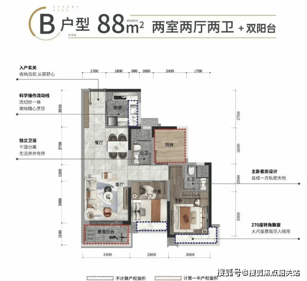 北向88㎡户型:单价1.65-1.7万/㎡,总价139-147万,性价比更高,通风效果佳,适合预算中等、注重实用性的购房者。