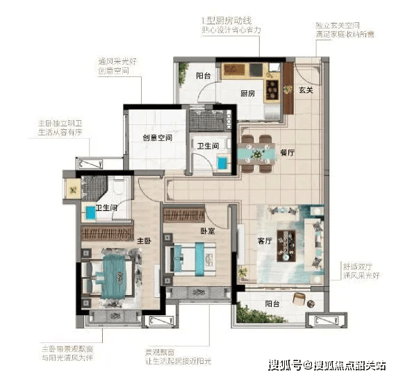 特点:双卫设计,主卧带飘窗,88㎡户型双阳台配置,采光通风俱佳。