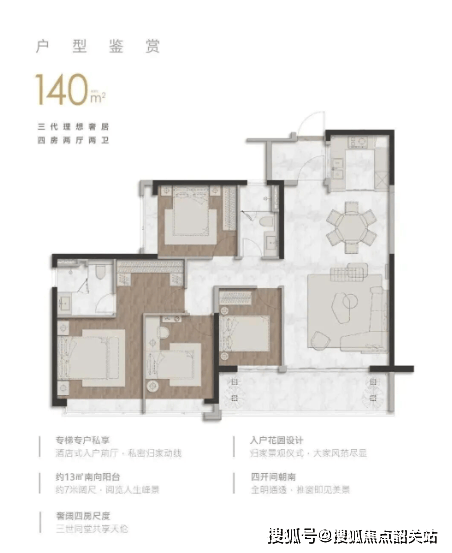 140㎡四房:四开间朝南,主卧套房带独立衣帽间;