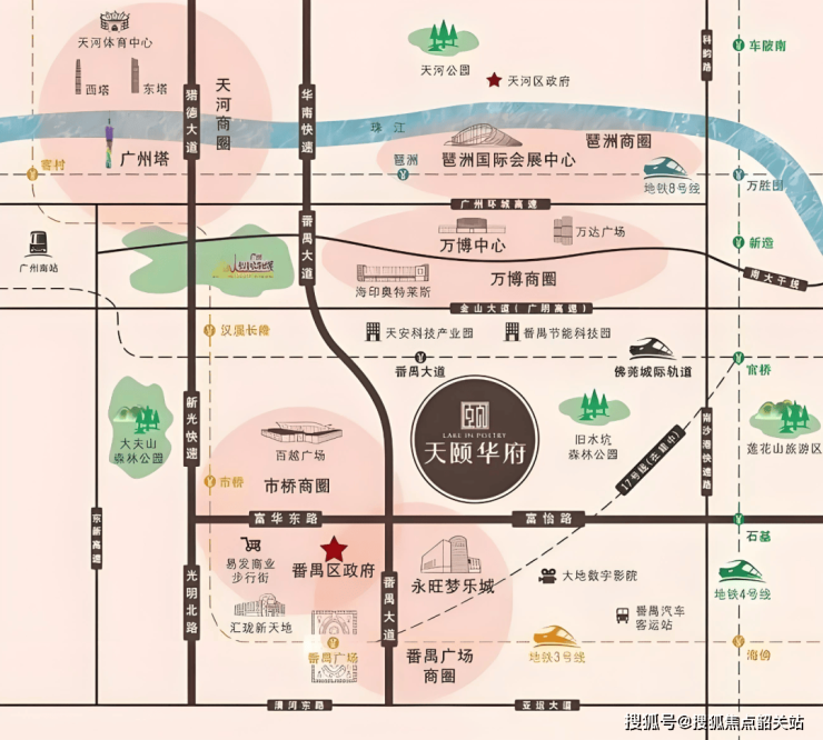 天颐华府坐落于番禺广场TOD枢纽,占据广州“南拓”战略核心区位,形成“五纵三横”立体路网: