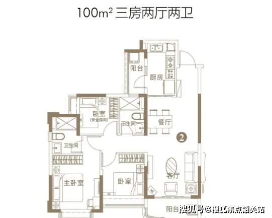100㎡三房户型:该户型注重居住的舒适度与功能性,南北通透设计,采光通风效果极佳。客厅与餐厅相连,形成开阔的公共活动空间,适合家庭聚会或宴请宾客;主卧套间设计,配备独立衣帽间与卫生间,提升了主人的居住品质;次卧与阳台相连,增加了空间的延展性,可作为休闲或储物空间使用。