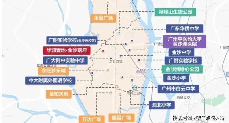 从上帝视角俯瞰,金沙洲正位于广州主城西部,与传统老城荔湾区仅一桥之隔,而与珠江新城的直线距离也不过约14公里。