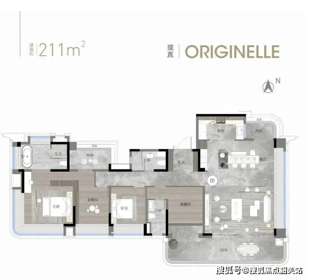 215㎡户型:横跨客厅与次卧的巨幅景观阳台,堪比空中花园;南向双套房设计,主卧配备休憩区、步入式衣帽间、L型270°飘窗,仪式感与实用性兼备;全屋飘窗+南北通透,实现无死角采光。