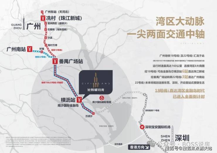 高铁方面,从项目出发20分钟可到达南沙庆盛高铁站,广深港高铁21分钟直达深圳北站,48分钟直达香港西九龙站。高速方面,项目周边环绕着南沙港快速、广澳高速、南二环高速等多条高速公路,可快速到达广州、东莞、中山等城市。港口方面,南沙国际邮轮母港是国内东南亚航线最多的邮轮港口,南沙客运港75分钟直达香港国际机场。航空方面,项目周边有广州、深圳、珠海、澳门、香港五大国际机场环绕,可快速通达全球各地。