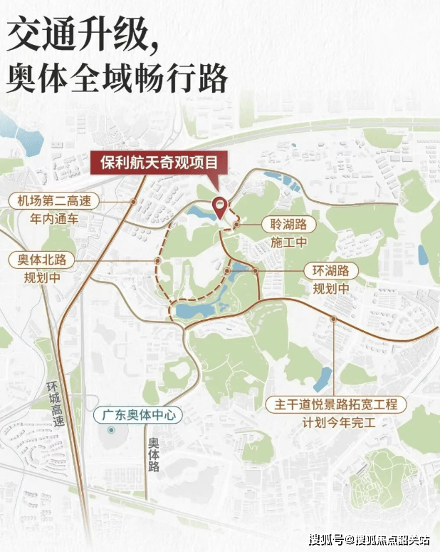 项目距地铁21号线大观路站直线距离约1.7公里,日常通勤需依赖接驳工具或自驾出行。虽然步行到达地铁站点需要约20分钟的时间,但这并未阻断项目与城市核心产业区的联系。向北眺望,智慧城与科学城的产业集群近在咫尺;向西驱车,约8公里可达金融城,约15公里即达珠江新城。随着十五届全运会筹备工作的推进,奥体板块周边的交通路网正在经历一轮显著的升级。总投资额达680亿元的道路建设项目正在实施中,旨在打通“六横七纵”的交通主动脉。其中,悦景路的拓宽工程即将完工,未来将实现与奥体路的无缝衔接,并直通机场第二高速;规划中的聆湖路建成后,将直接连接大观街与大观中路主干道,进一步提升前往智慧城片区的通行效率。这种依托重大赛事契机推动的基础设施完善,使得该区域在保持低密居住环境的同时,依然能够维持与城市核心功能区的高效连通。根据相关建设计划,这些道路升级将在未来几年内逐步兑现,为居民的出行提供更多便利选择。