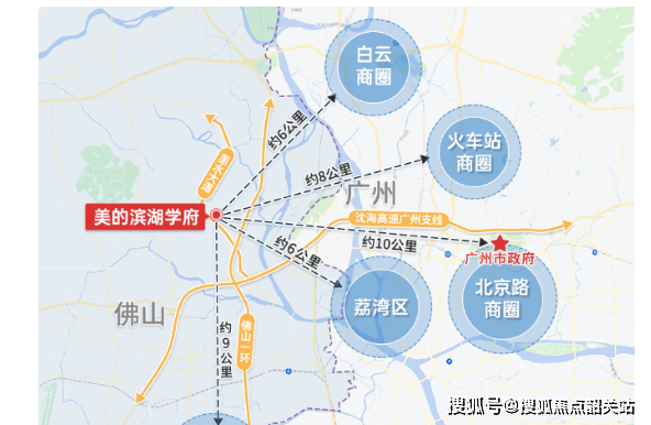 美的滨湖学府地理位置优越,距离广州市政府仅约10公里,属于广州核心城区生活圈的一部分。从这里出发,驾车前往白云、荔湾等区域只需约20分钟,越秀大约需要25分钟,而到达天河则大约耗时40分钟。未来,随着佛山地铁5号线(预计2030年通车)、8号线(预计2027年通车)以及里水有轨电车的建设完成,居民将能享受到更加便捷的公共交通服务。特别是三条轨道线路均能直接串联广州地铁网络,极大提升了出行的便利性。