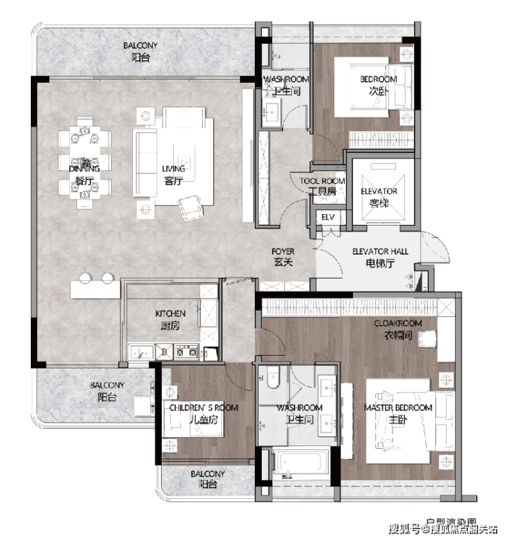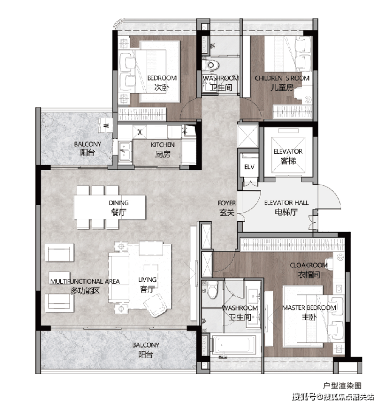 建面约200平方米的四房户型:拥有宽敞的电梯间和独立入户玄关,保证私密性。南北双阳台设计,其中约7.5米超大阳台环抱客厅,提供了极佳的生活体验。