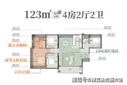 建面约123㎡ 四房:大方厅设计,豪华大主卧带大衣帽间,总价约620-650万。