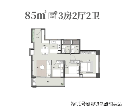 建面约85㎡ 三房:玄关一侧带L型飘窗,开放式厨房,四开间朝南,景观阳台联通客厅和次卧,总价约370-400万。