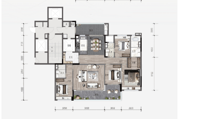 280㎡六房户型:作为项目的高端户型,该户型尽显尊贵与奢华,四个休息房间均配备独立卫生间,保障每位家庭成员的私密性与便捷性,提升居住舒适度。电梯厅旁设有专属鞋房,打造归家仪式感的同时,提供充足收纳空间,保持室内整洁。中厨面积更大,甚至能放下岛台,满足家庭烹饪需求,同时也能作为家庭互动的空间;客厅开间达7.6米,空间极致开阔,搭配超大玻璃幕墙,将室外山水园林景观尽收眼底,打造沉浸式观景体验,适合高端改善家庭或追求圈层品质的业主。