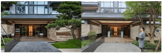 细节之处更见匠心,项目将巨石元素融入会所、庭院、园林及建筑内部,每栋建筑一楼入户庭院两侧设有整排石墙,大堂中央的庵治石直接到顶,营造酒店式归家体验。车库作为容易被忽略的细节,也经过精心打磨,天花板采用木纹铝板格栅吊顶,搭配艺术曲面发光灯带,打破传统车库昏暗的刻板印象;墙面创意畔山墙绘与地上会所庭院风格一脉相承,连防火门在内的每扇门都采用隐藏式设计,尽显高端质感。
