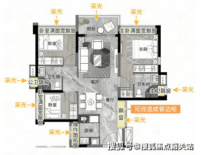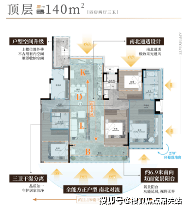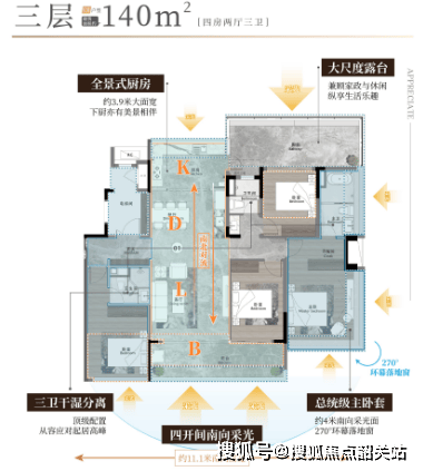 项目户型涵盖98-140㎡三至五房,设计理念为动静分区、空间灵活、全能方正。顶层户型“星穹”设有全明浴室、独立家政间及天台大露台,实现会客、休闲、娱乐多功能需求。中间层户型“星幕”则强调独立玄关、双卫干湿分离及宽幕瞰景阳台,实现生活便利与舒适。