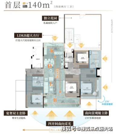 户型设计充分考虑家庭多功能需求:全南向宽景阳台保证充足采光;独立家政间与储物空间提高生活便利;天台及露台增加户外社交与休闲空间。项目大平层与小洋楼结合,使居住者既能享受宽阔舒适空间,又可独享独立庭院和露台,满足高端改善型居住需求。