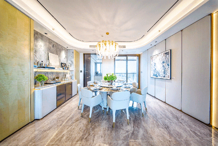 项目的设计团队致力于打造超越市场认知的纯粹产品力。以建面约226㎡户型为例,独立电梯厅+入户玄关对景为业主带来了归家的尊崇感。而室内的超级聚厅设计,将南向几乎一半的空间用于构建一个集家庭聚会和商业会晤于一体的多功能区域,使得景观所提供的情感价值被巧妙融入日常生活之中。