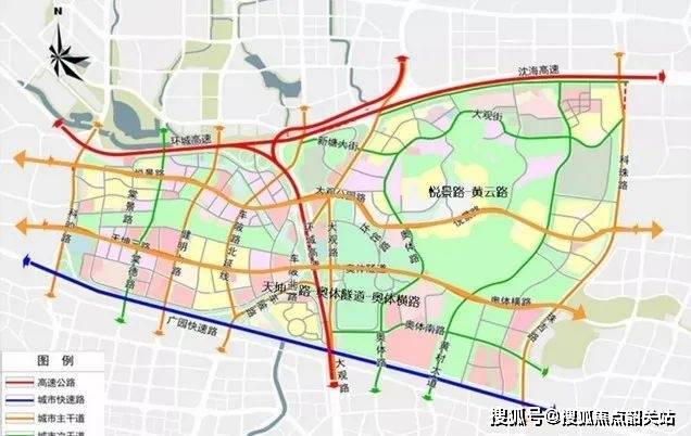 2条主干道:悦景路-黄云路、天坤三路-奥体隧道-奥体横路,实现东西向主要交通联系。