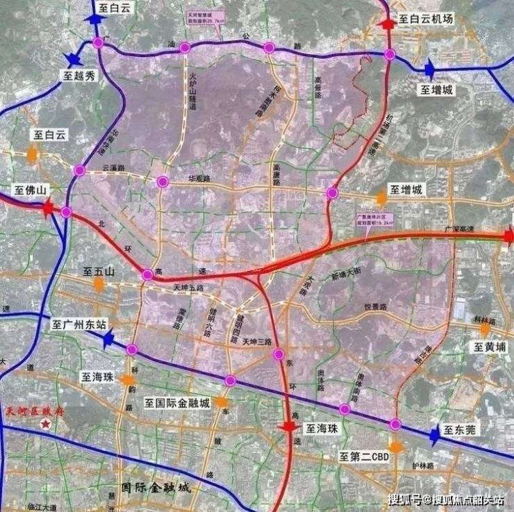 “三横两纵”高快速路,实现白云机场,广州南站的紧密衔接,实现与智慧城、金融城、第二CBD等重要片区和其他城市的通达。