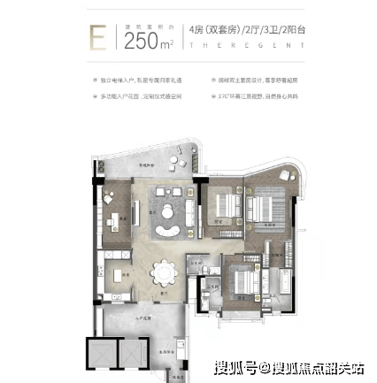 A户型:270平方米环幕江景四房,配备9米超大邮轮式阳台,一线望江无遮挡,专梯专户设计,提供墅级空中双花园。