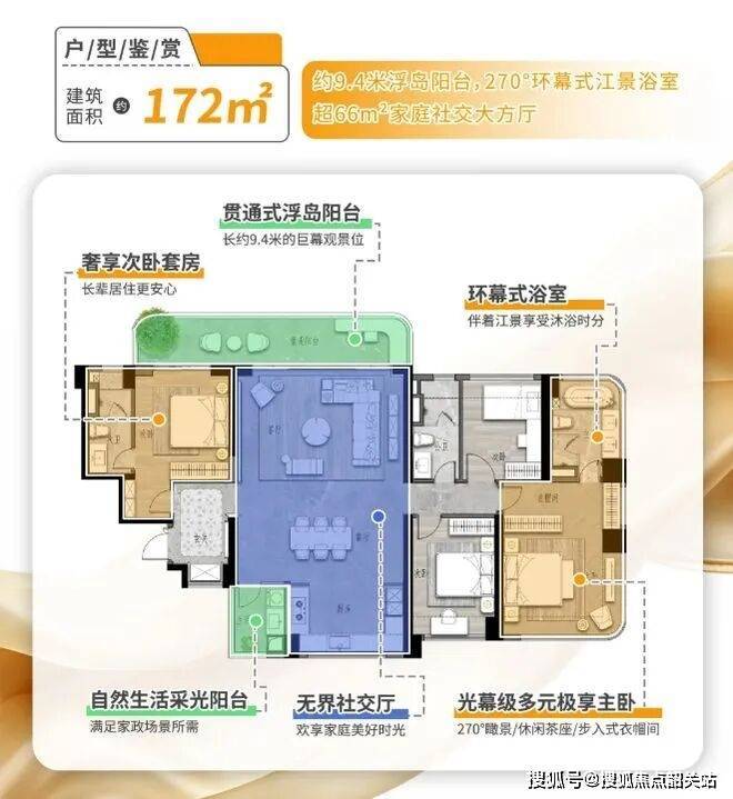 贯通式浮岛阳台:长约9.4米的阳台,从常规L型调整为无折角的连贯U型设计,实现超越广角的8k级环幕视野,让滨江盛景尽收眼底,同时保障极致隐私。