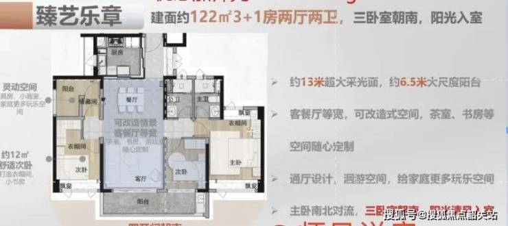 建面约119㎡四房,全屋四开间朝南搭配超阔阳台,客厅联通一个次卧,开间达到6.5米,住出大平层才有的舒适感,如果加玻璃门或窗帘,功能更加百变;全景厨房门可开可合,妈妈在厨房做饭也能观察到客厅孩子的实时情况;超级阔卧,摆下1.8米的双人大床也不成问题,主卧南北对流,配置女王级衣帽间、梳妆台,对女人而言简直是“秒杀式”设计。